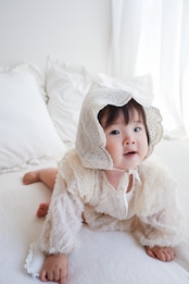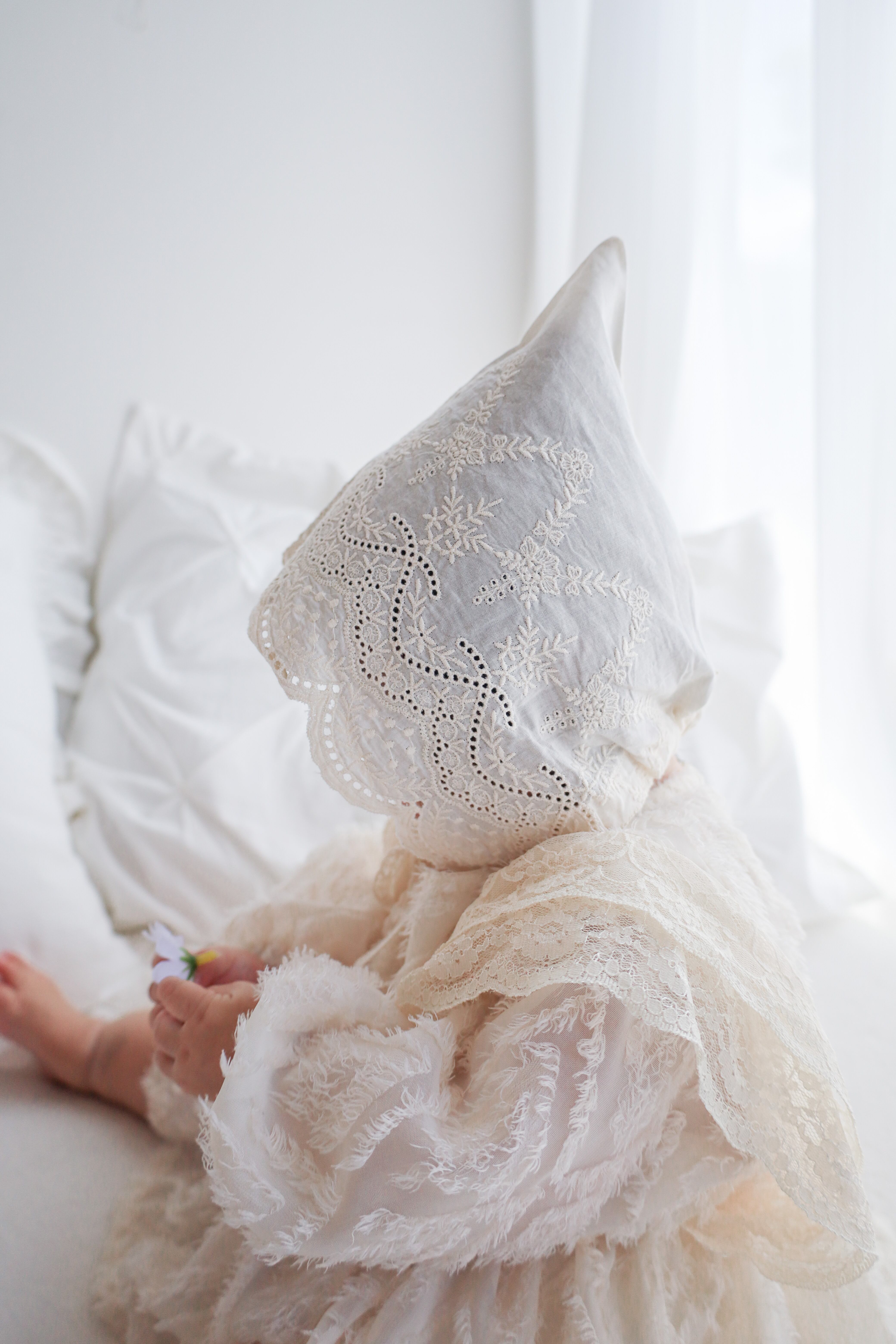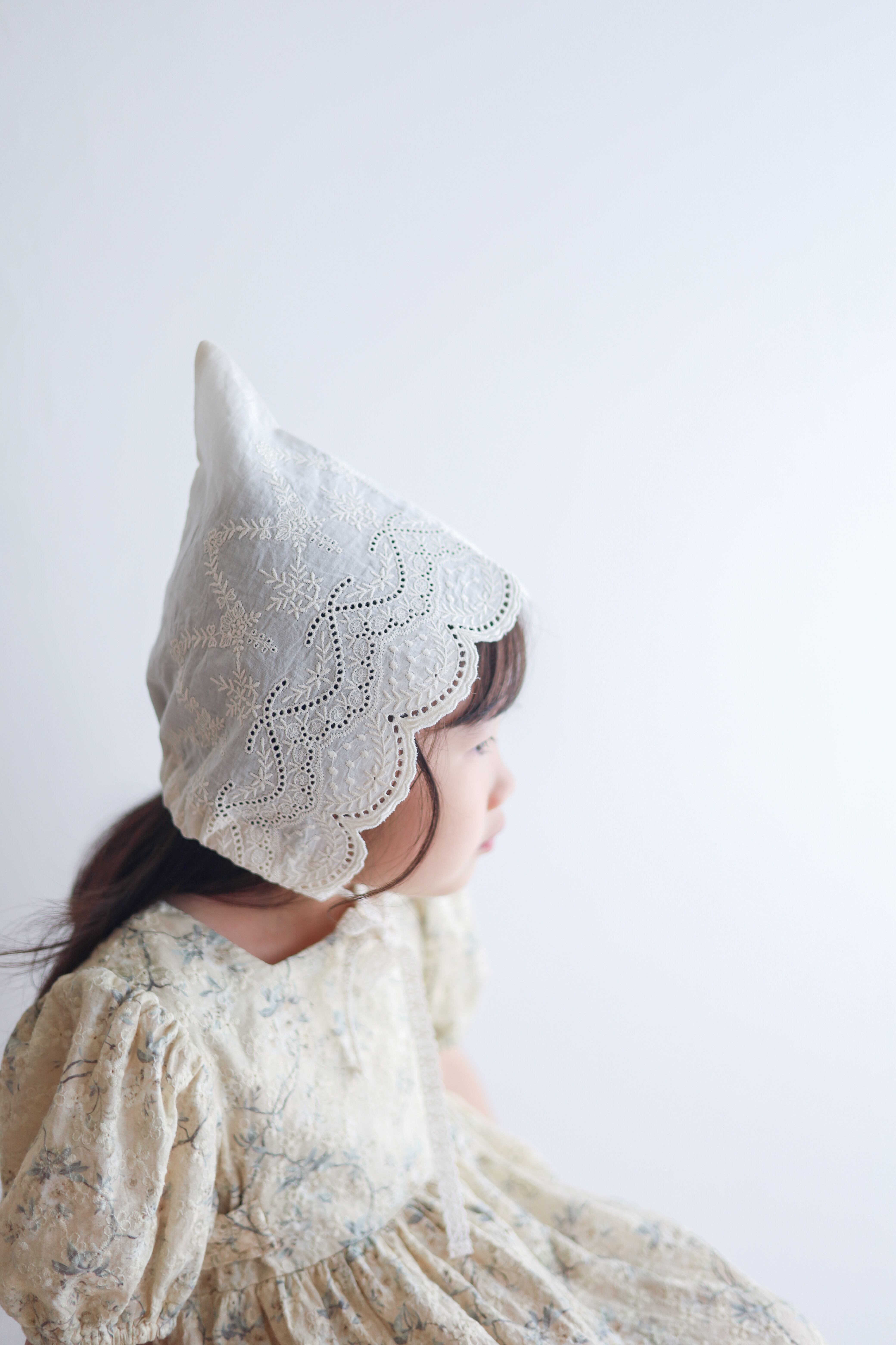 繊細な刺繍とスカラップのデザインが特徴的なボンネット♡ 普段使いはもちろんセレモニードレスとの相性も抜群です♡ 生成りカラーなのでいろんなコーディネートに合わせやすいアイテム♪