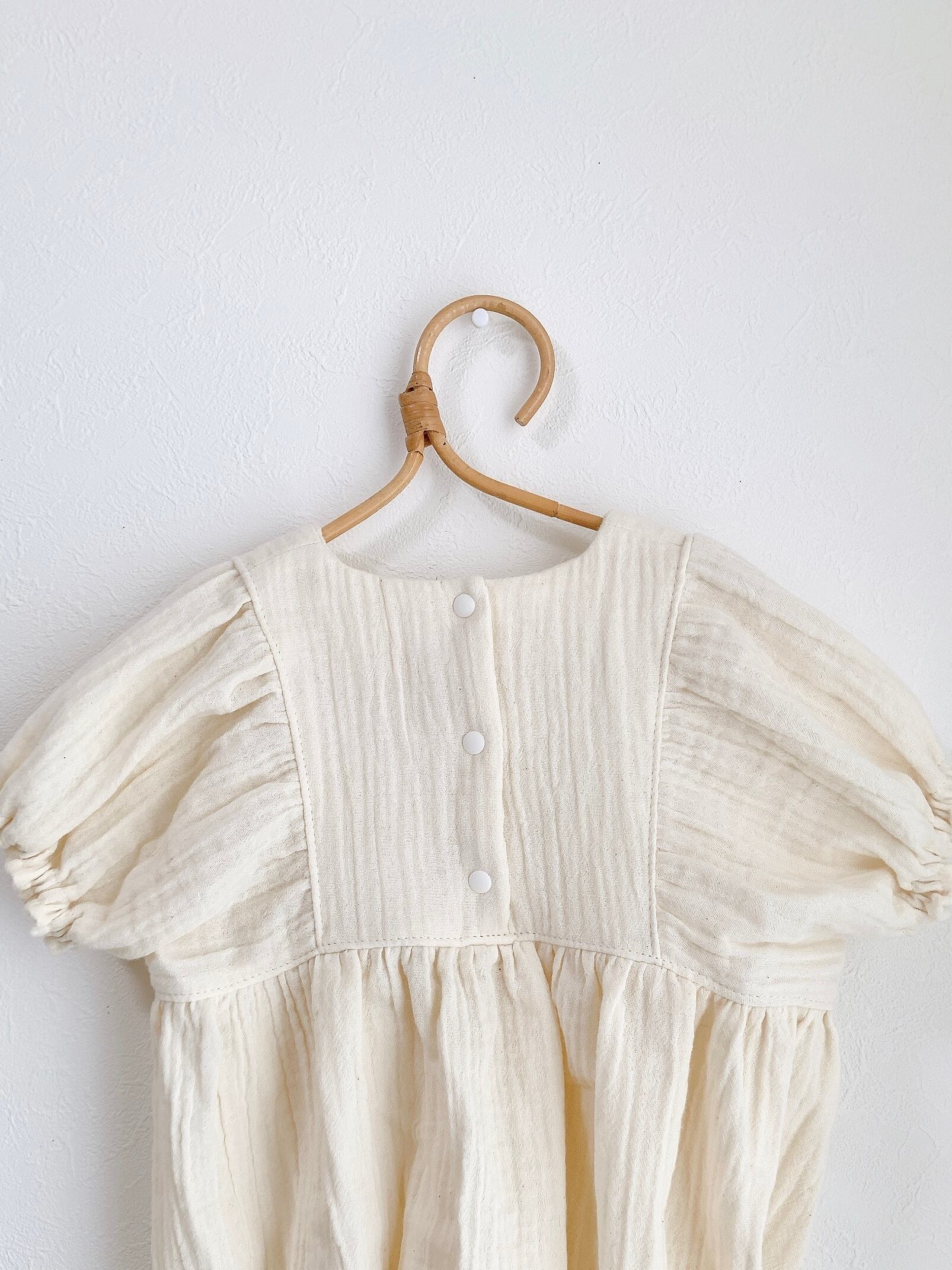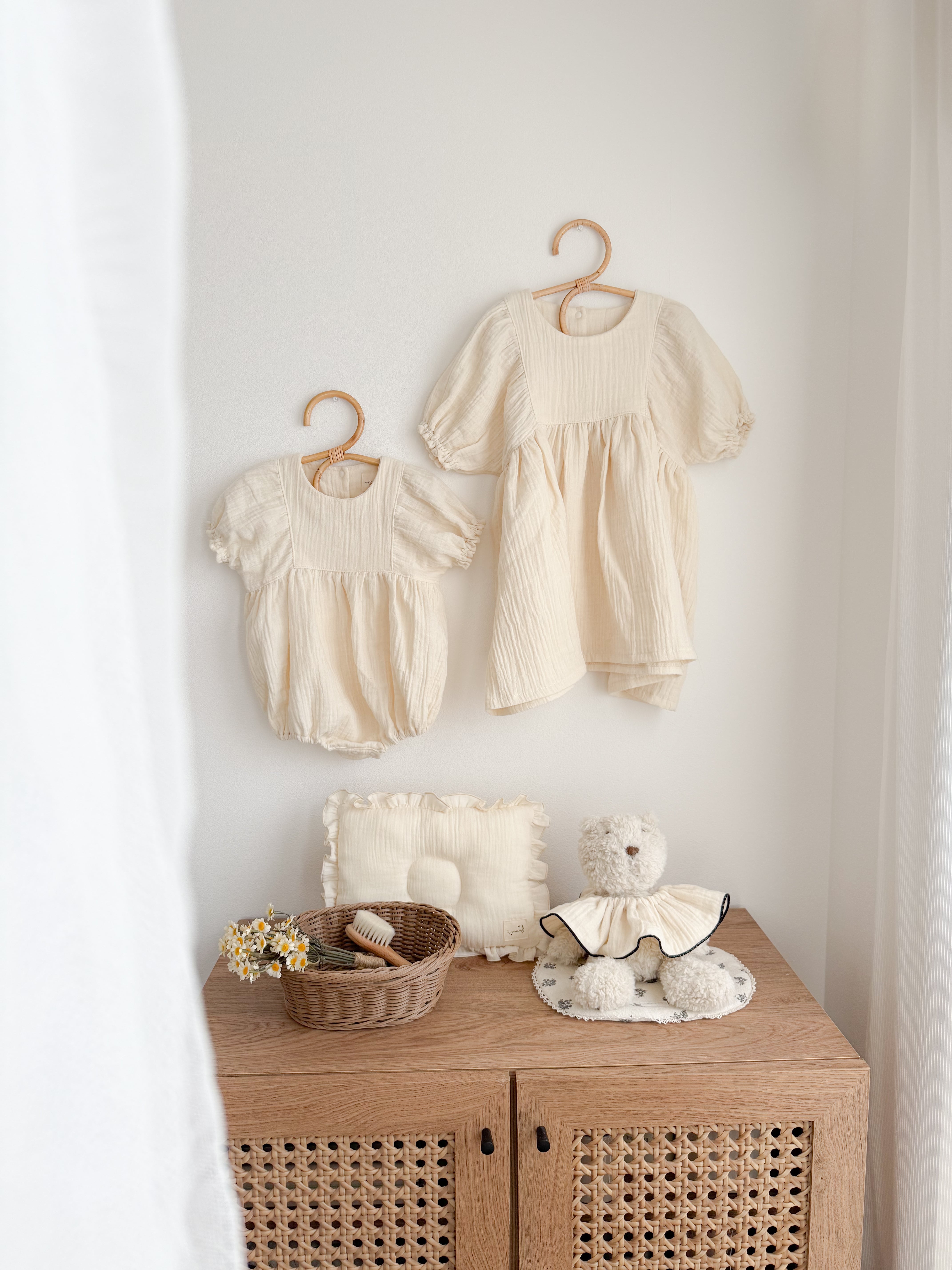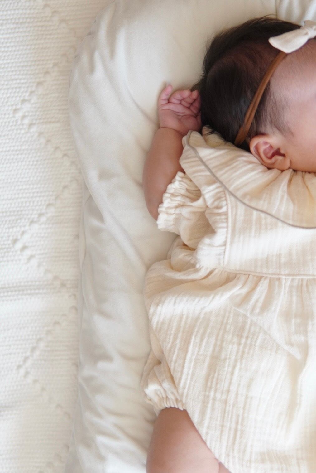 国産ガーゼ生地を使用したカルムロンパース&ワンピース♡ナチュラルな中にきちんと感があるデザインで、特別な日にも日常にもそっと寄り添い優しく祝うように…♡