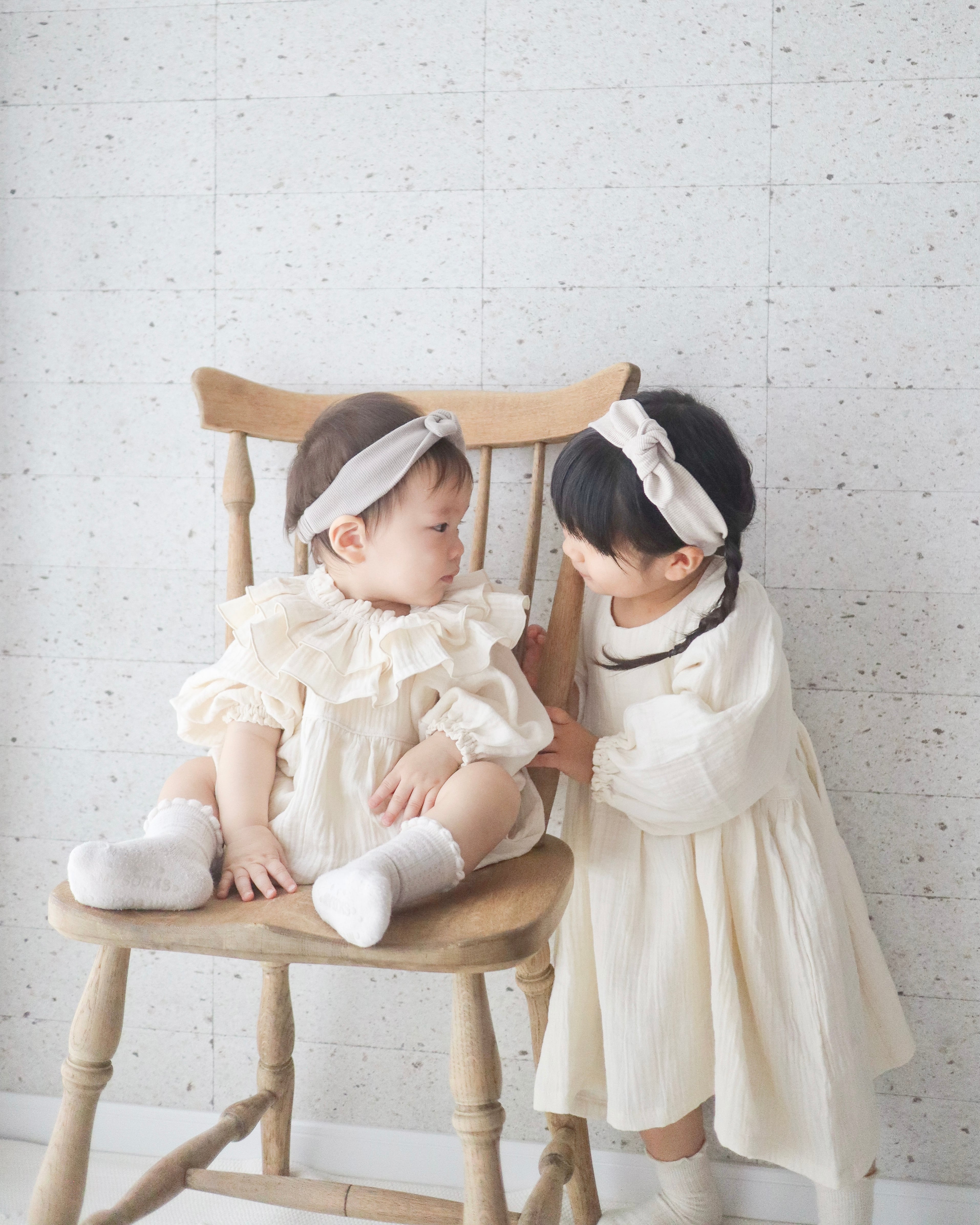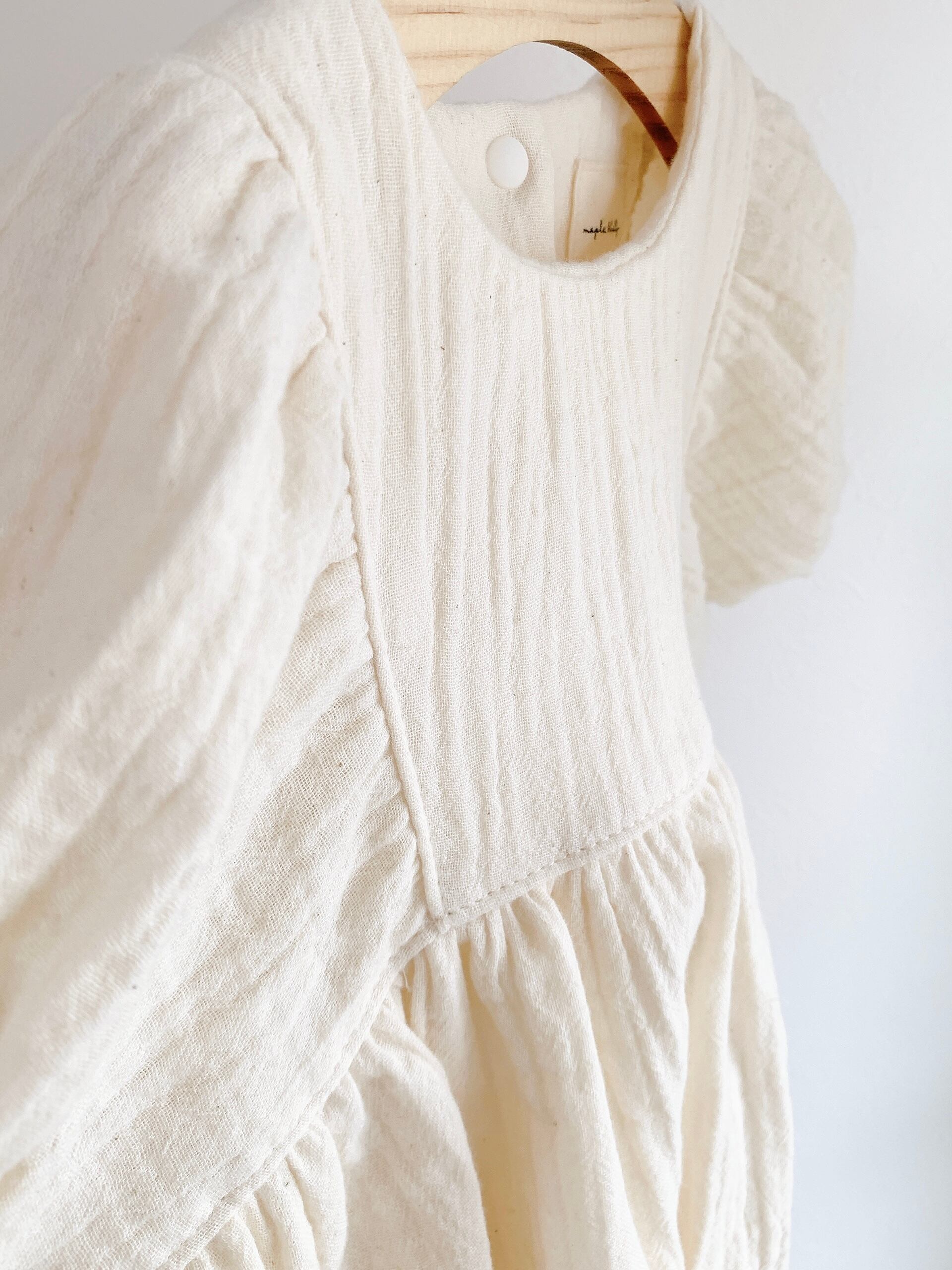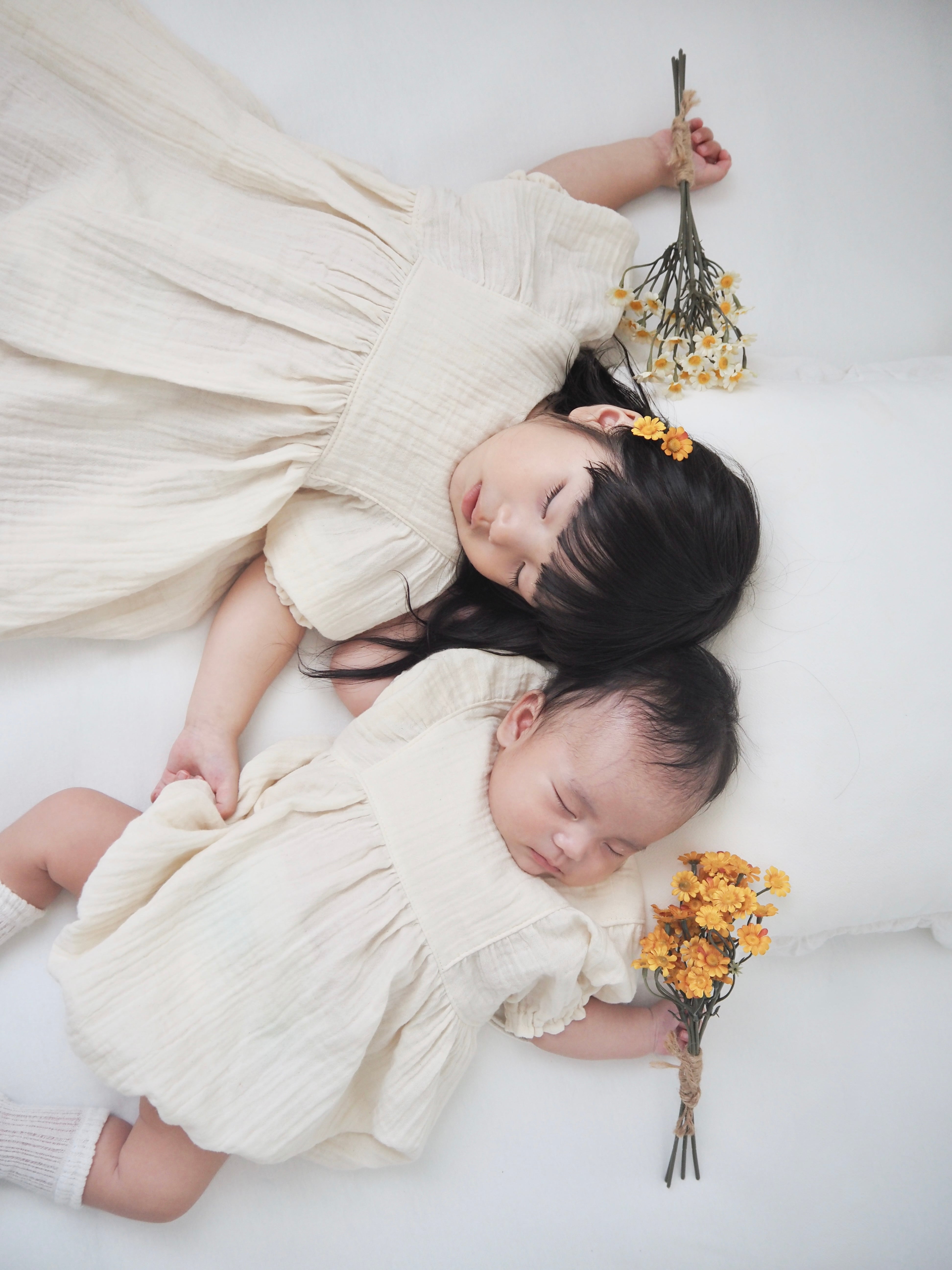 国産ガーゼ生地を使用したカルムロンパース&ワンピース♡ナチュラルな中にきちんと感があるデザインで、特別な日にも日常にもそっと寄り添い優しく祝うように…♡