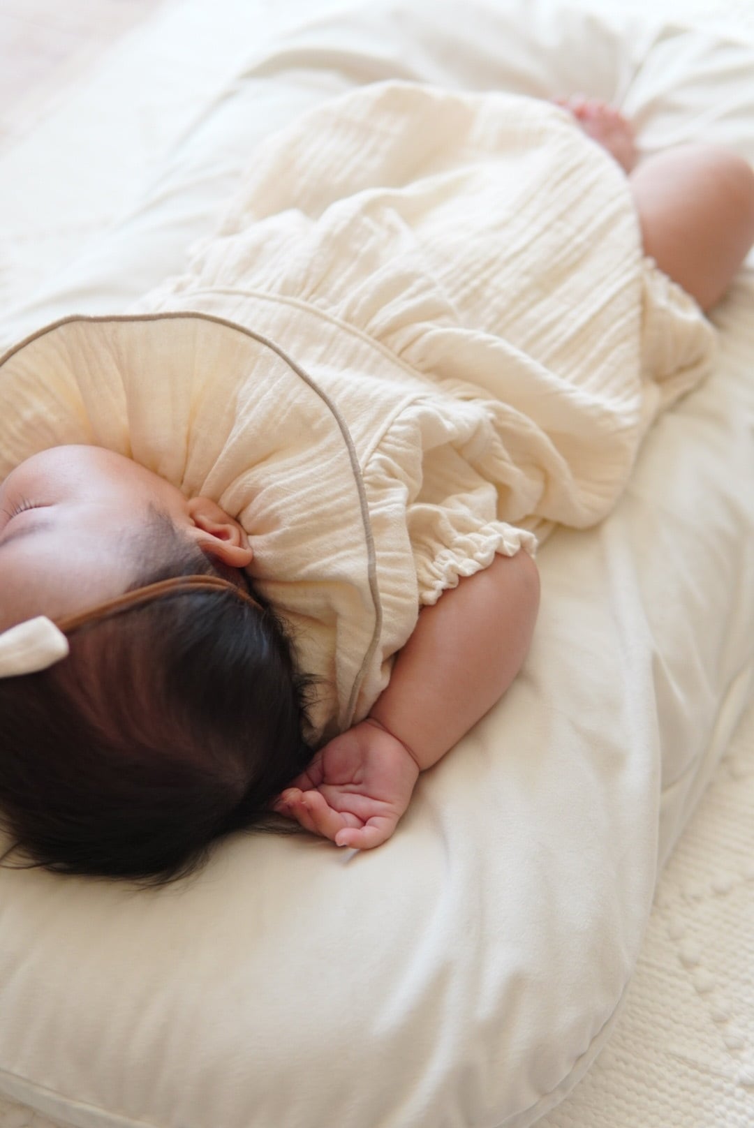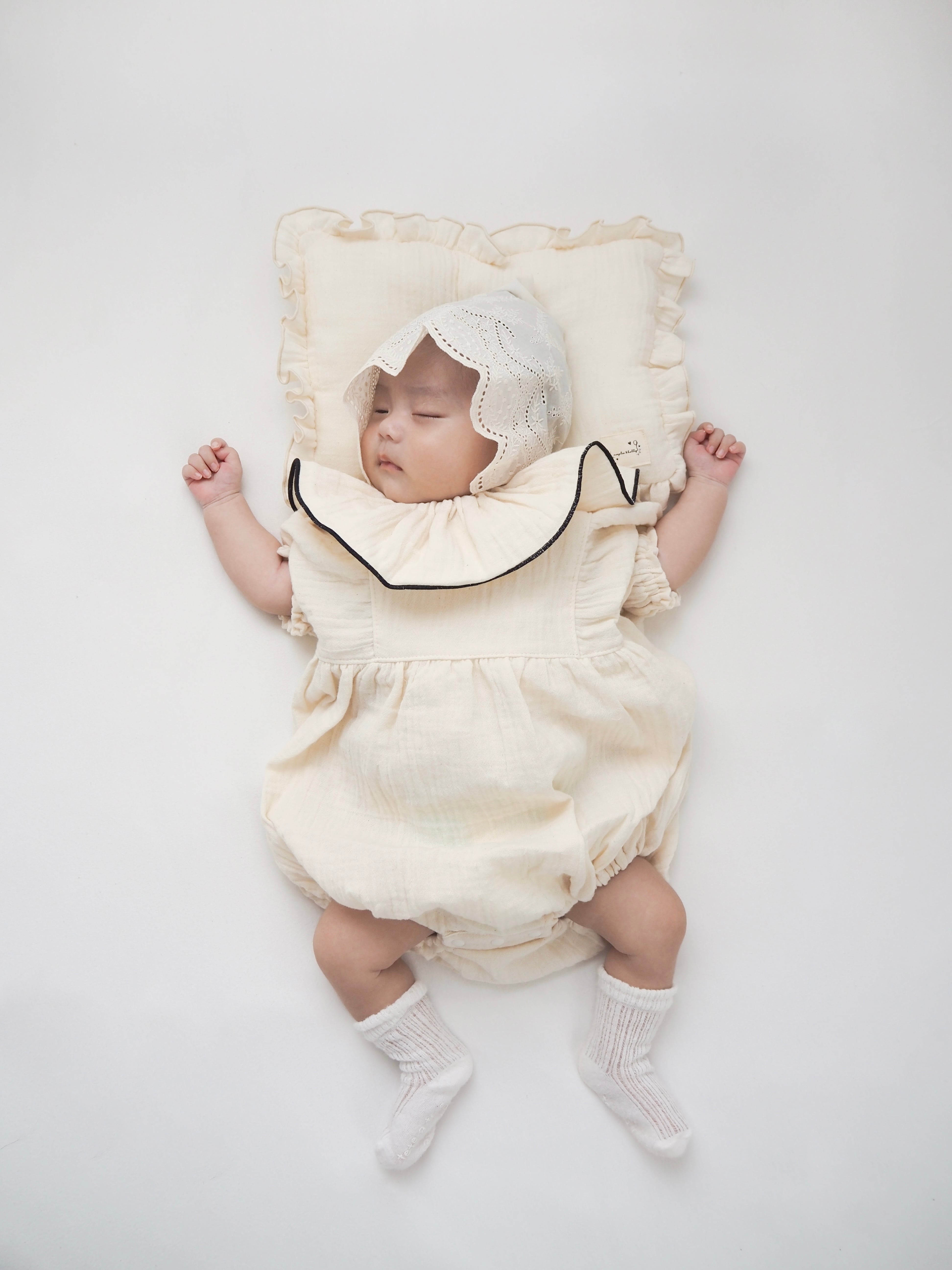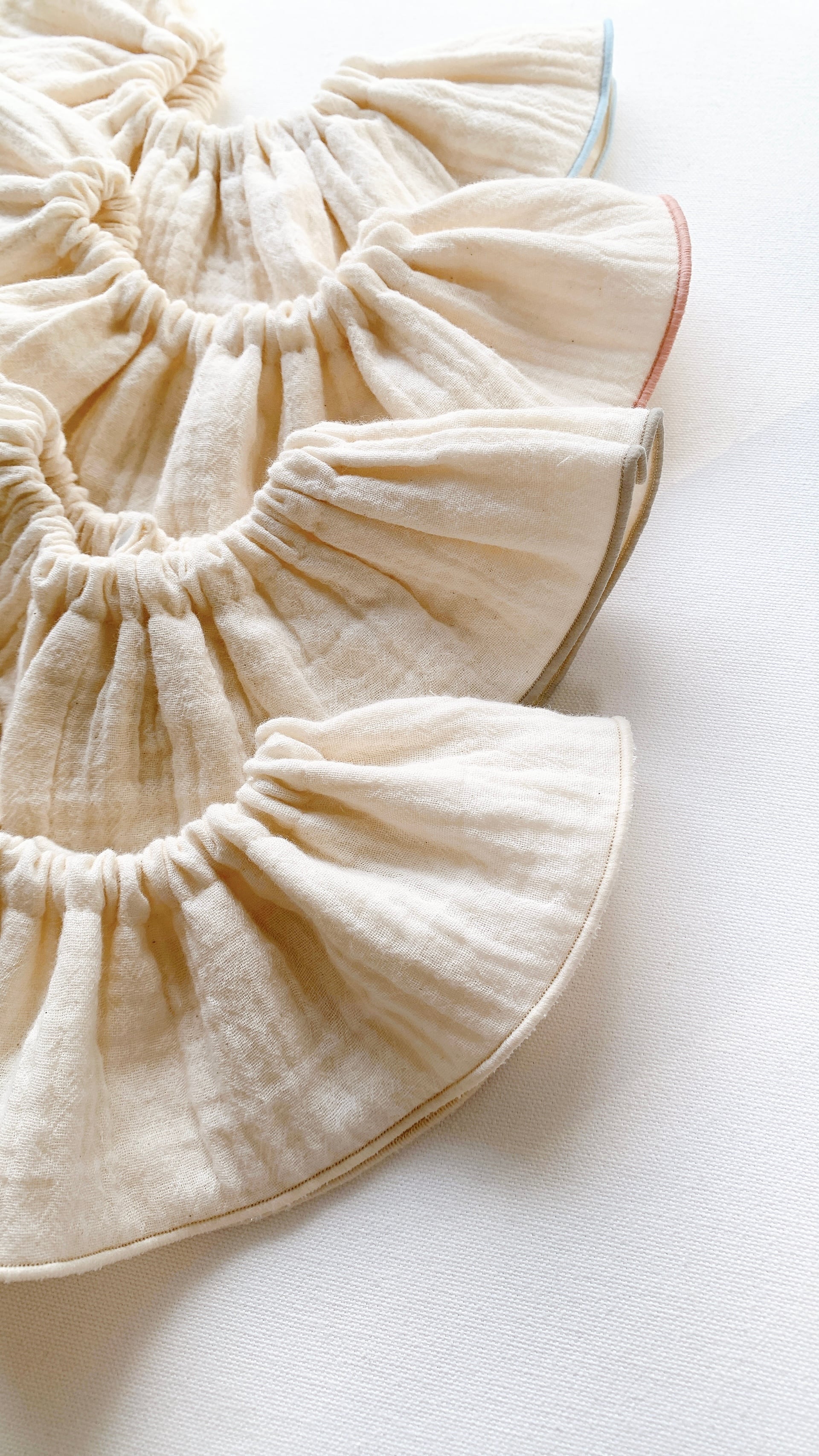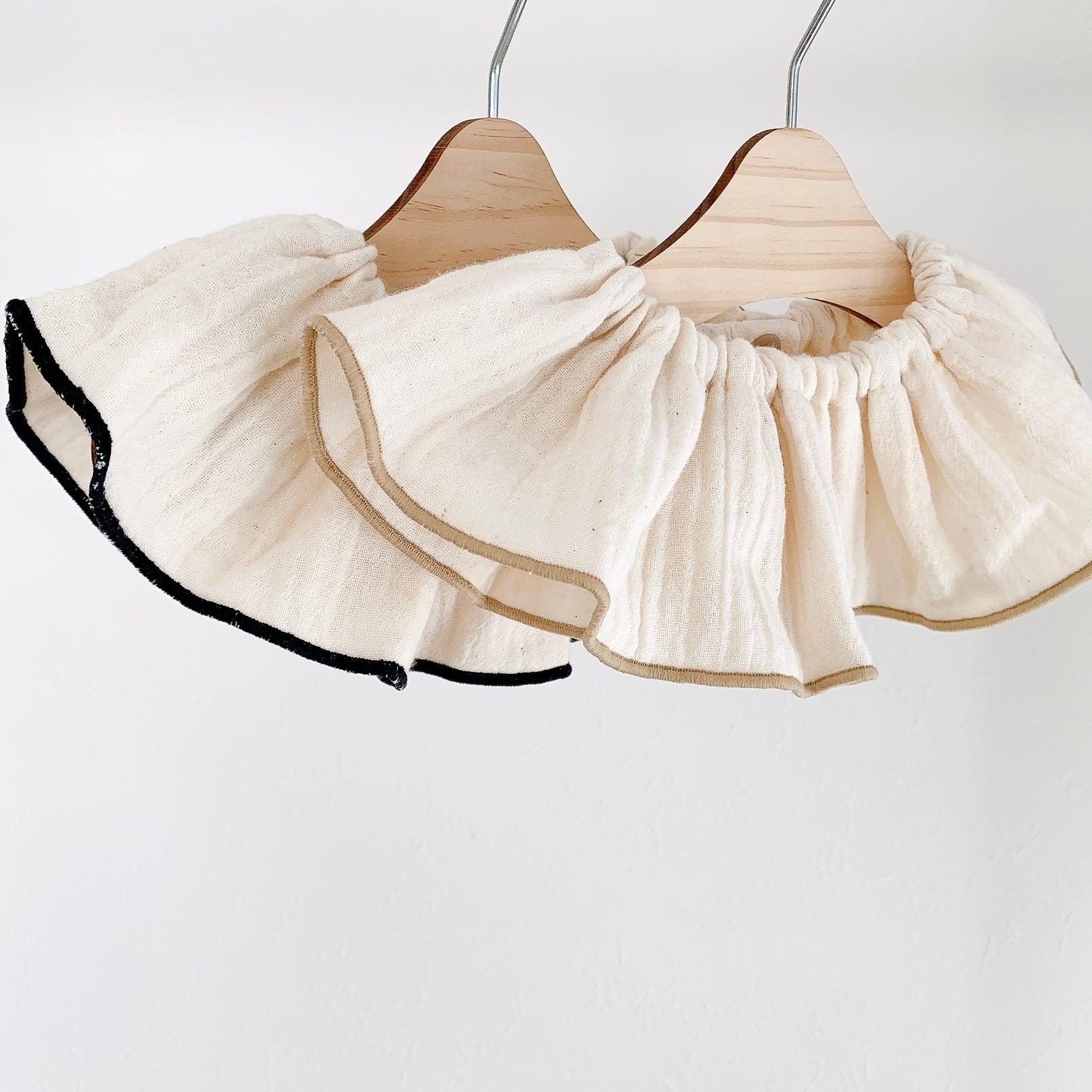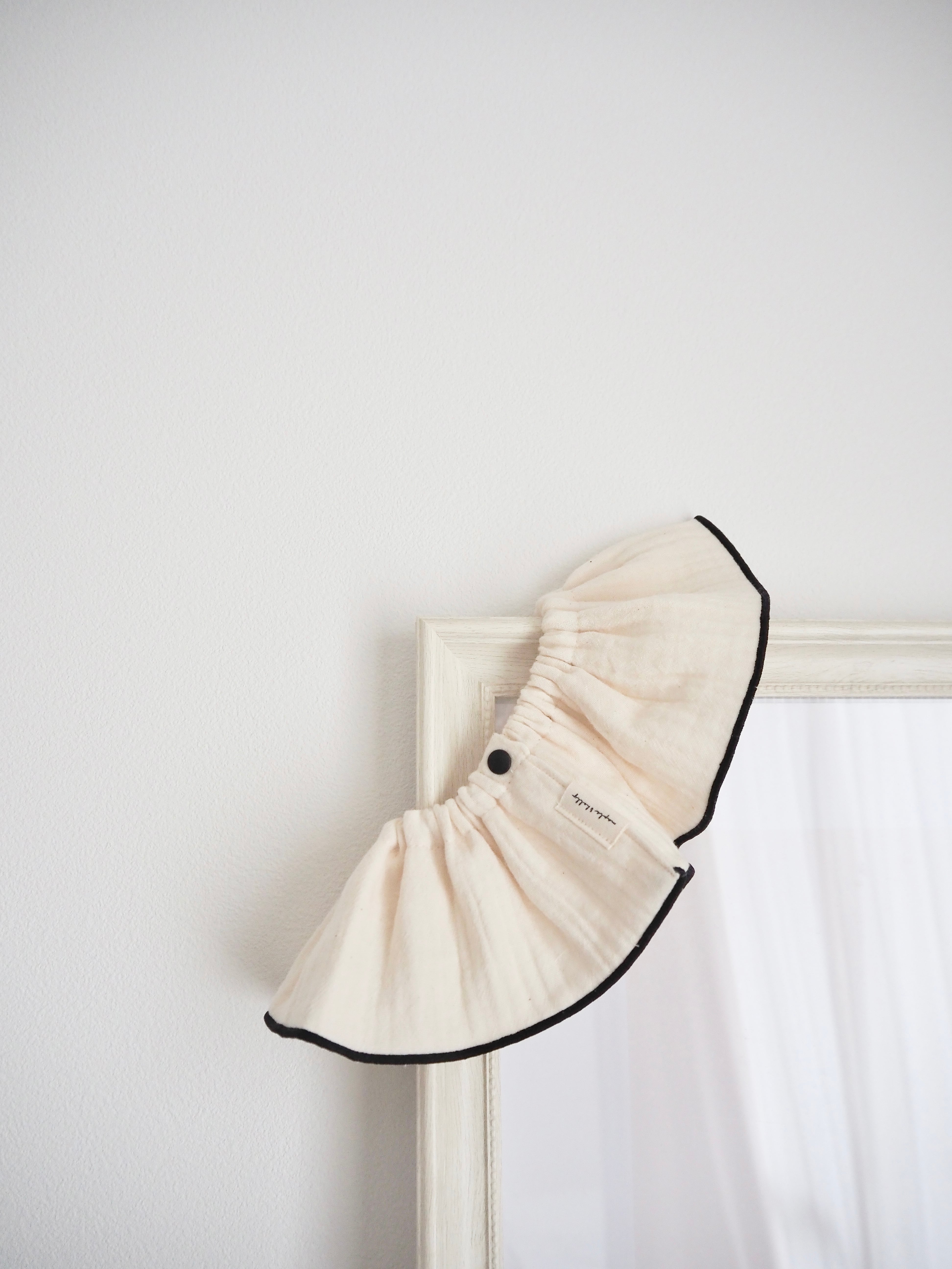 ダブルガーゼを重ねた4重ガーゼのドーナツスタイ❃ パイピングとスナップボタンがアクセントの少し大人っぽいデザイン♡ クラシカルなお洋服やシンプルコーディネートにも合わせられるスタイです♡