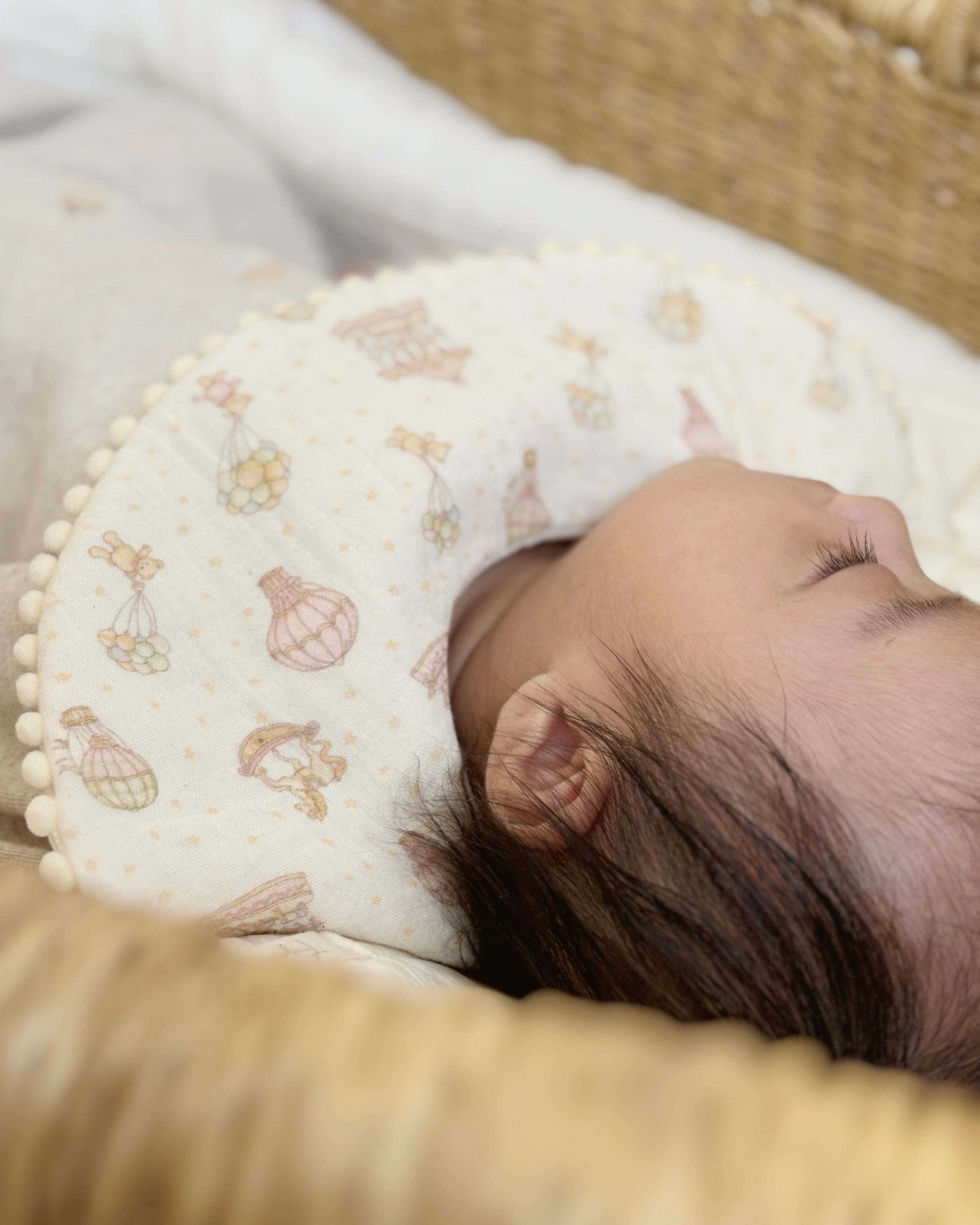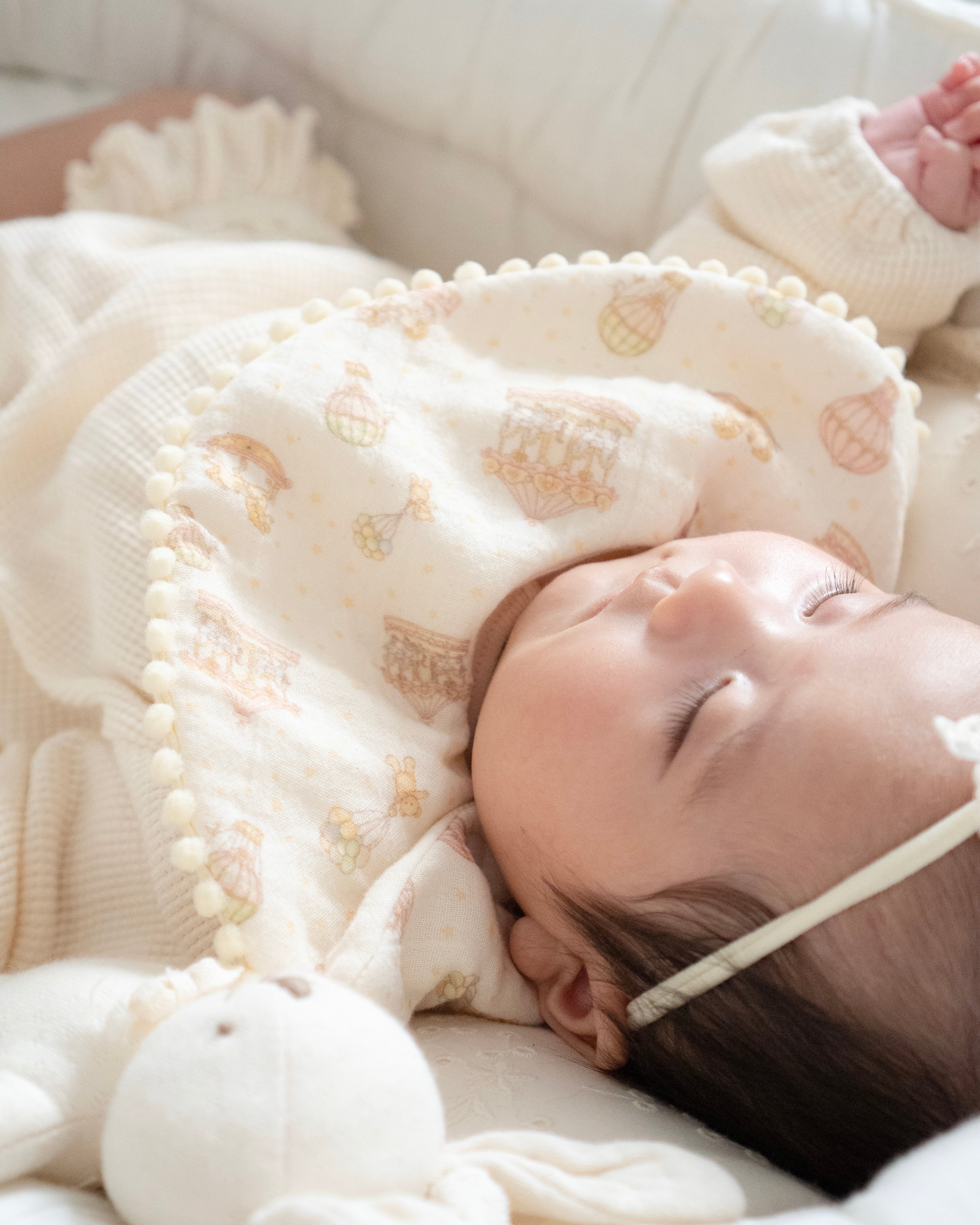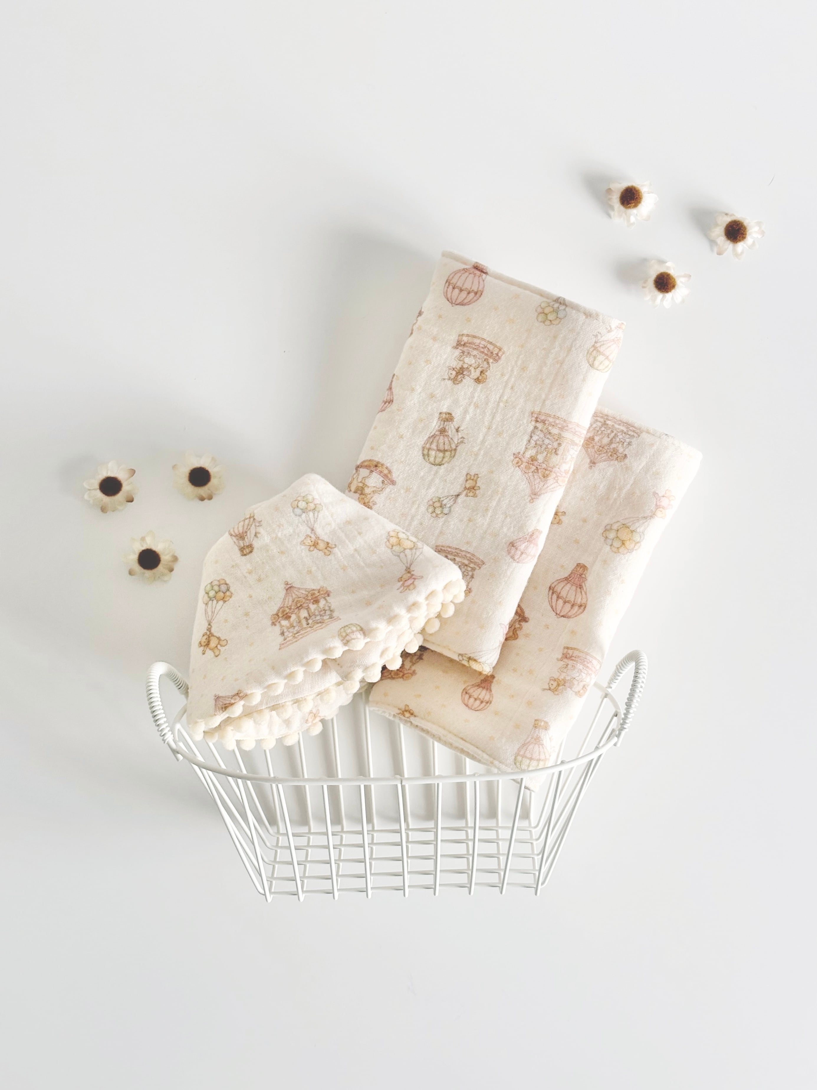 スタイ・ハンカチはぽこぽこした風合いの生地です。アイロン不要ですが、気になる方は中温で当て布をした上でアイロンがけお願い致します。