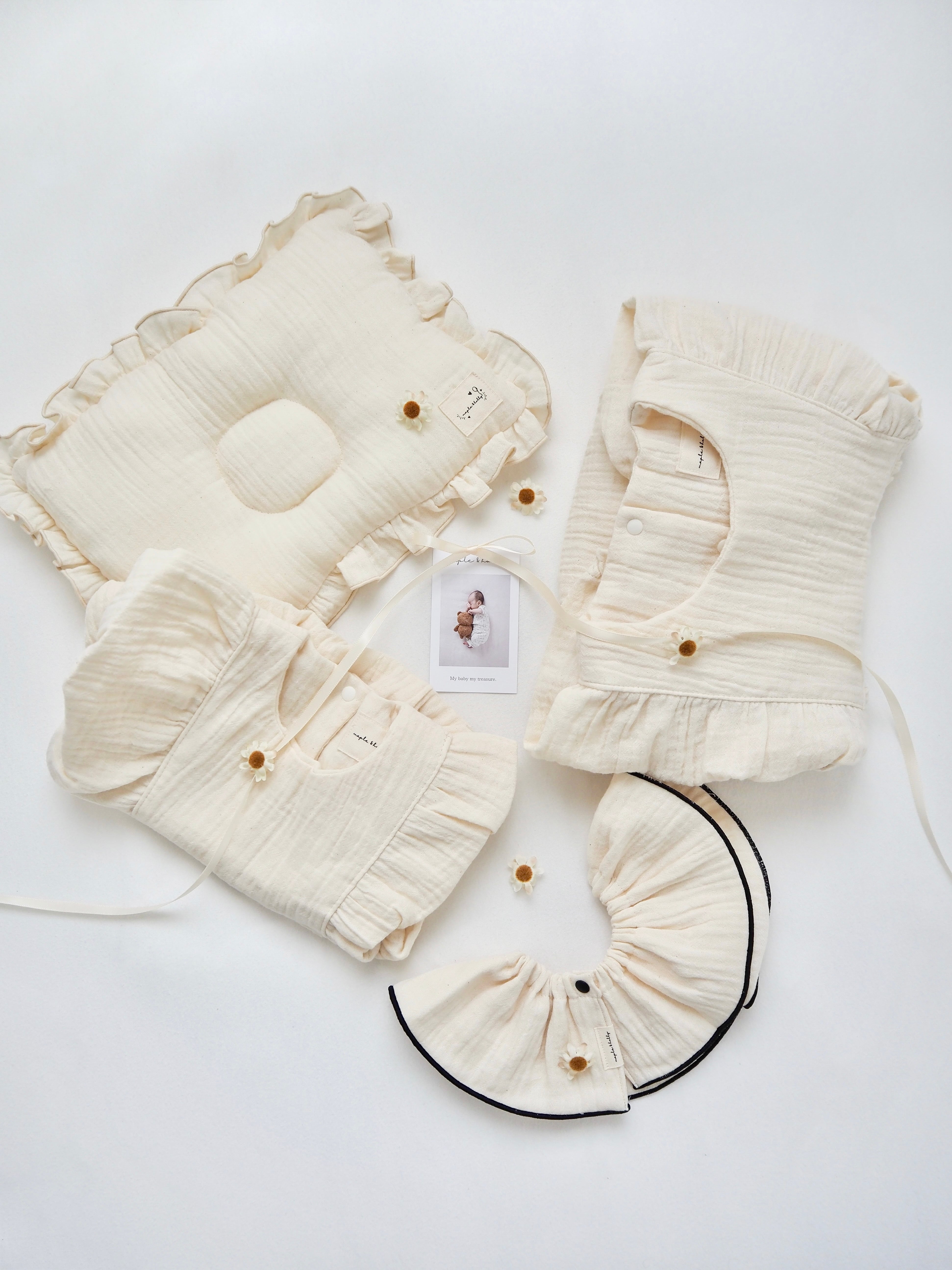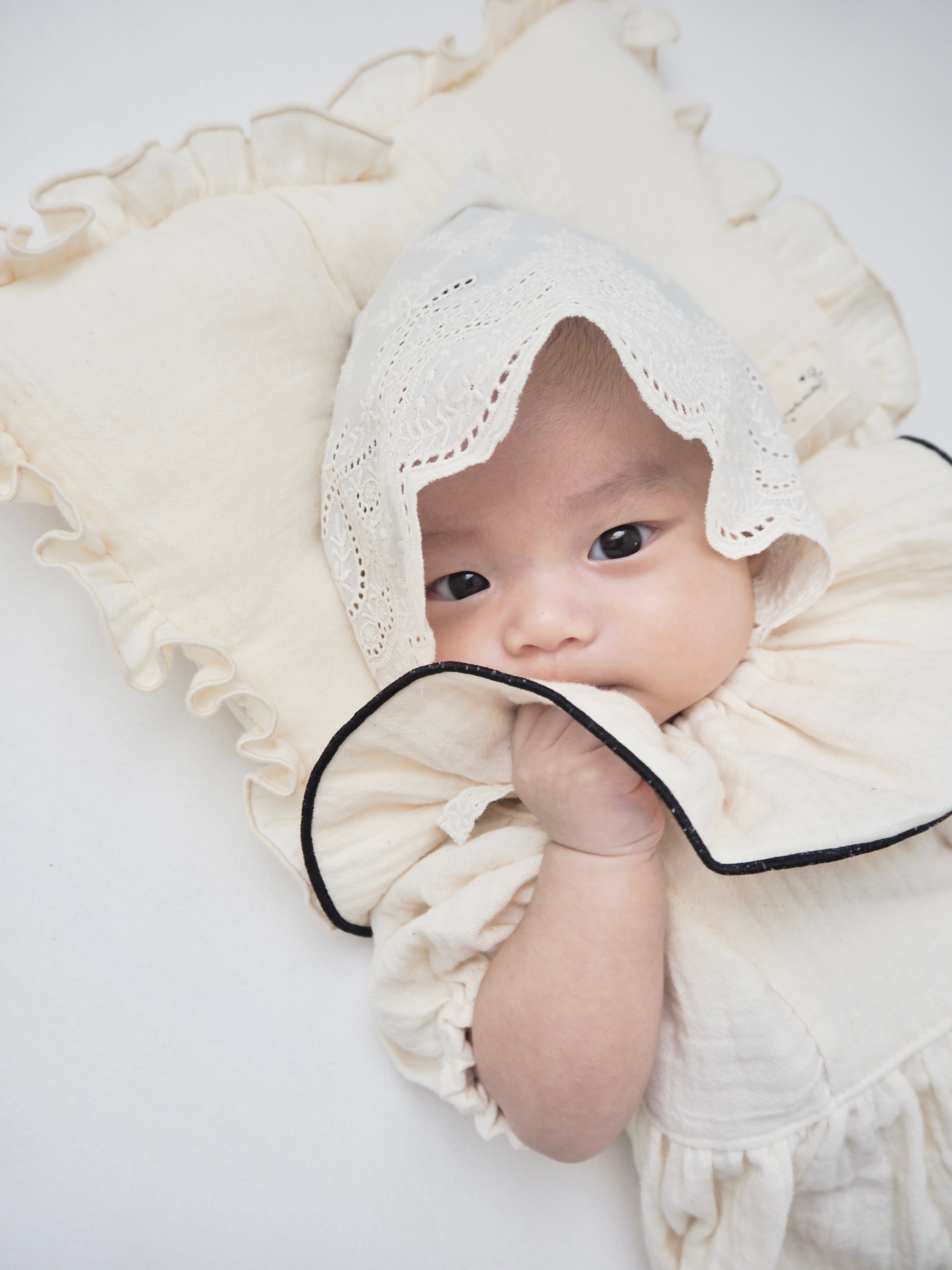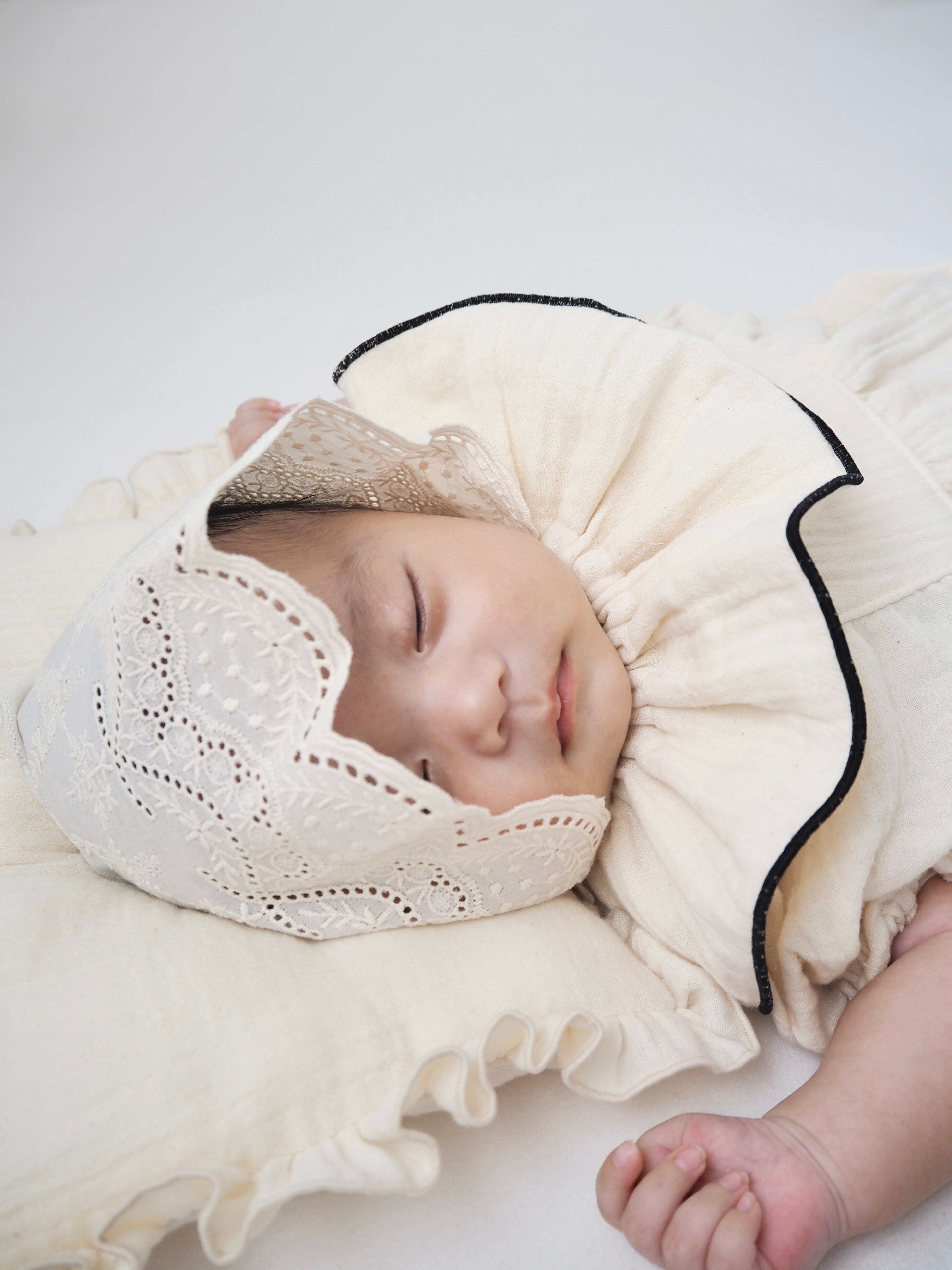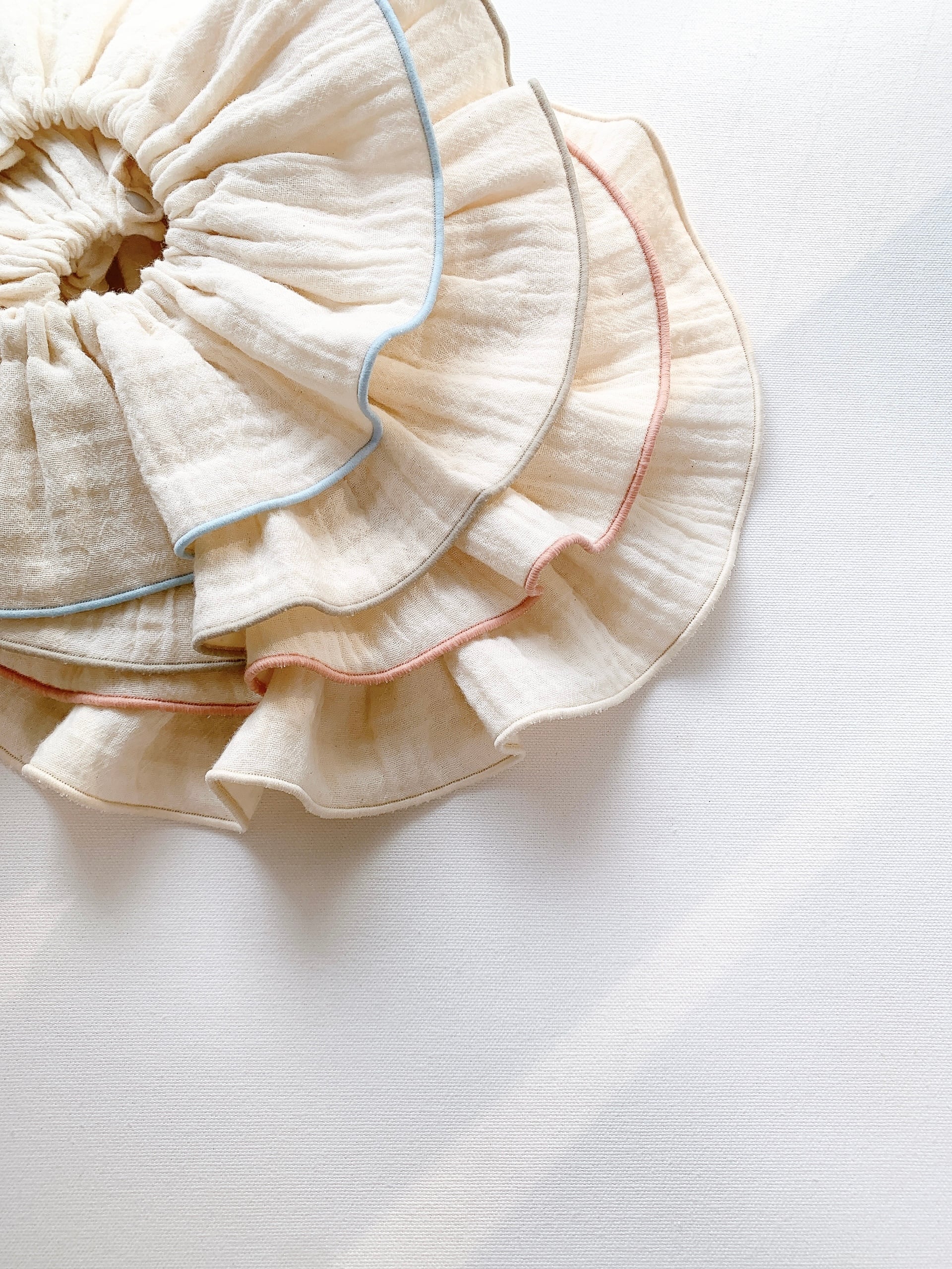 ダブルガーゼを重ねた4重ガーゼのドーナツスタイ❃ パイピングとスナップボタンがアクセントの少し大人っぽいデザイン♡ クラシカルなお洋服やシンプルコーディネートにも合わせられるスタイです♡